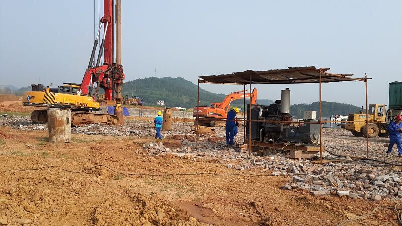 施工內(nèi)容及工程量:灌注樁鋼筋籠制作、運輸及安放,鉆孔樁成孔、商品砼采買、砼灌注。旋挖鉆孔灌注樁樁基工程共完成1244根,樁徑800mm,樁身混凝土強(qiáng)度等級為C30,完成總米數(shù)23458.18米,設(shè)計混凝土方量11791.37方,實際灌注混凝土15624m³,后壓漿共使用900噸復(fù)合硅酸鹽水泥,加工鋼筋791.56t。