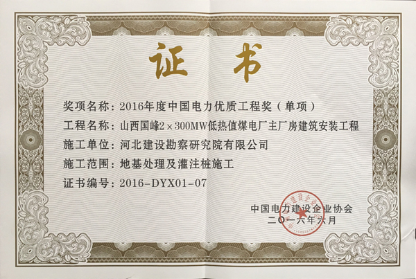 山西國(guó)峰2x300MW電廠項(xiàng)目獲得2016年度中國(guó)電力優(yōu)質(zhì)工程獎(jiǎng)
