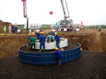 我公司承擔(dān)了該風(fēng)電場(chǎng)的土建工程及接地,施工內(nèi)容主要包括風(fēng)電機(jī)組基礎(chǔ)33座、變壓器基礎(chǔ)33座,共完成土石方開(kāi)挖與回填40112m3,完成混凝土12578m³。