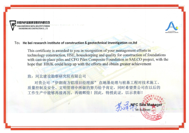 我公司承建的伊朗南方鋁項(xiàng)目,自開工以來精心策劃、有效組織、認(rèn)真施工、積極與業(yè)主配合,保質(zhì)保量完成了施工進(jìn)度。在施工過程中業(yè)主對(duì)我公司伊朗南方鋁項(xiàng)目部在技術(shù)施工、質(zhì)量控制及安全、文明管理中所做的努力給予了肯定,并授予表彰證書。