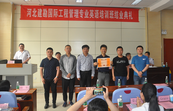 公司委托石家莊鐵道大學繼續(xù)教育學院舉辦的首屆國際工程管理專業(yè)英語培訓班(共29人,分6組),經過28天的緊張培訓,已經完成全部課程的學習。2018年5月14日下午,石家莊鐵道大學第九實驗室103教室,書聲瑯瑯,掌聲雷鳴,公司首屆國際工程管理專業(yè)英語培訓班結業(yè)典禮在這里舉行,出席結業(yè)典禮的有:公司總經理李華偉、總工程師聶慶科、人力資源部主任張軍旗及全體學員;石家莊鐵道大學副校長陳進杰、繼續(xù)教育學院院長王書海、繼續(xù)教育學院副院長楊杰、外語系黨支部書記林治華、外語系副主任李玉潔、培訓班班主任孫艷以及教師和助教。