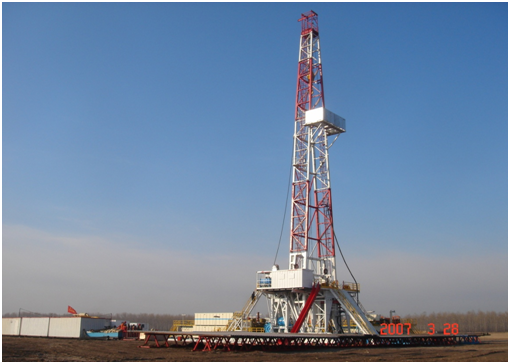該型頁(yè)巖氣鉆機(jī),包括底座、井架、動(dòng)力裝置、傳動(dòng)機(jī)構(gòu)、聯(lián)動(dòng)機(jī)構(gòu)、轉(zhuǎn)盤、絞車、游車、高壓管路、泥漿泵以及氣控系統(tǒng)。其優(yōu)點(diǎn)在于:通過(guò)采用密閉水冷式絞車,滾筒摩擦轂冷卻采用離心泵強(qiáng)制循環(huán)水冷卻方式,主滾筒摩擦轂上帶有水套和水循環(huán)管線;動(dòng)力裝置采用三臺(tái)柴油發(fā)動(dòng)機(jī),同時(shí)三臺(tái)柴油發(fā)動(dòng)機(jī)之間設(shè)置聯(lián)動(dòng)機(jī)構(gòu),增大功率;配備兩臺(tái)3NB 1300C泥漿泵,能滿足噴射鉆井的需要。