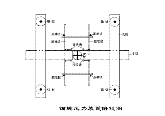 錨樁反力裝置就是將被測(cè)樁周?chē)鷮?duì)稱(chēng)的幾根錨樁用錨筋與反力架連接起來(lái),依靠樁頂?shù)那Ы镯攲⒎戳茼斊?,由被連接的錨樁提供反力,提供反力的大小由錨樁數(shù)量,反力架強(qiáng)度和被連接錨樁的抗拔力決定。錨樁反力裝置一般不會(huì)受現(xiàn)場(chǎng)條件和加載噸位數(shù)的限制,當(dāng)條件允許,采用工程樁作錨樁是最經(jīng)濟(jì)的。