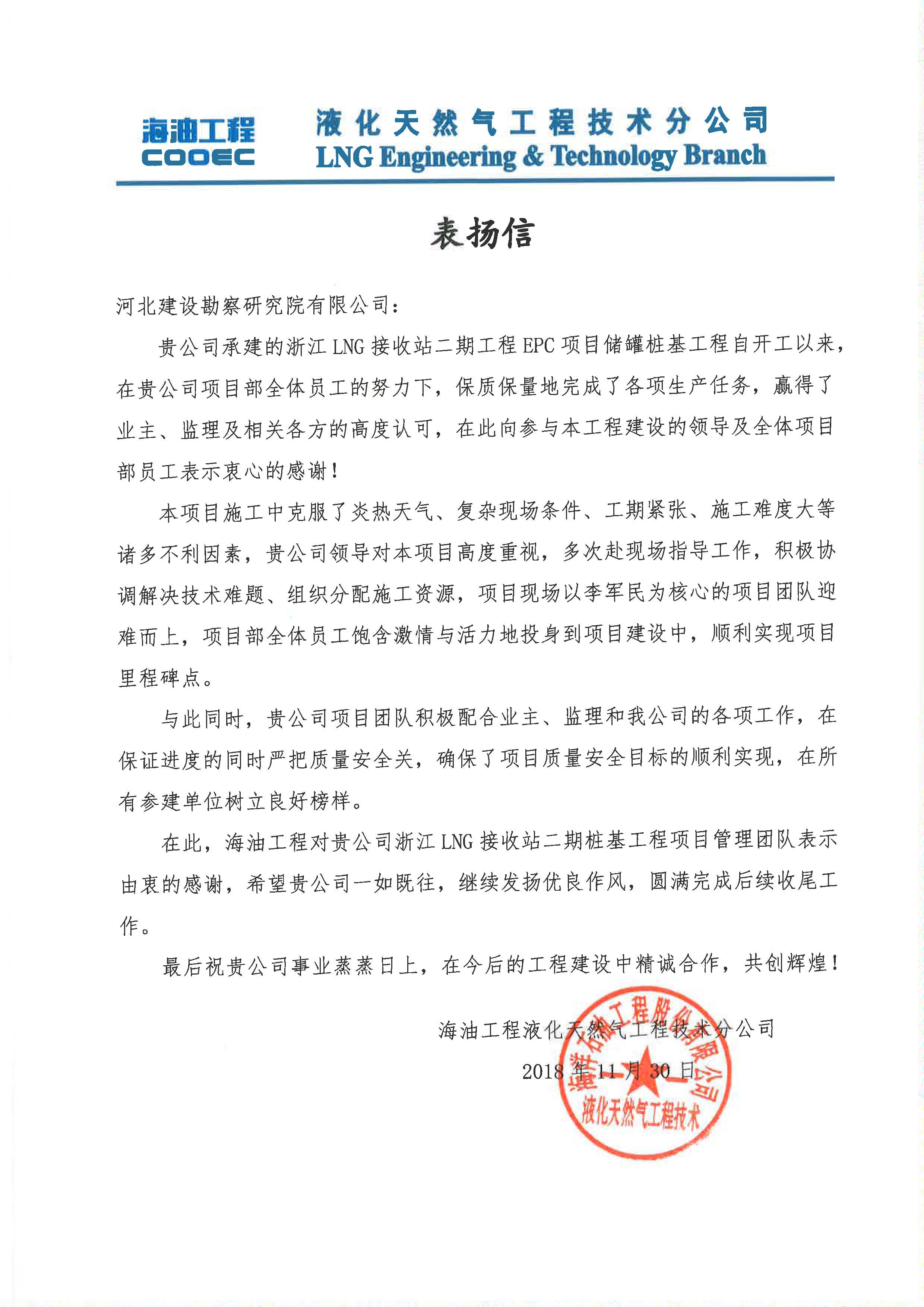 我公司浙江LNG接收站二期工程EPC項(xiàng)目?jī)?chǔ)罐樁基工程項(xiàng)目部收到業(yè)主發(fā)來表揚(yáng)信