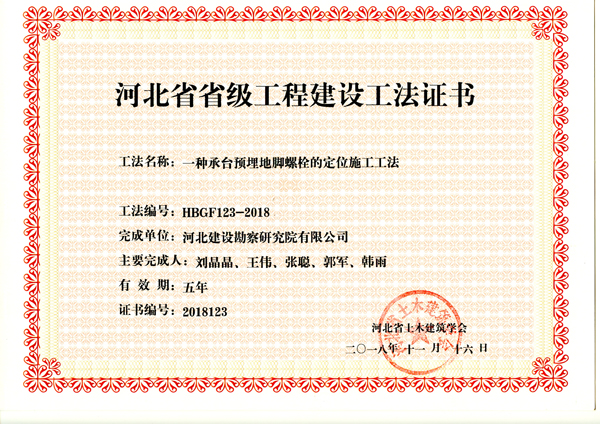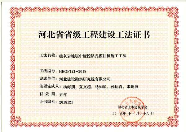 近日,河北省土木建筑學(xué)會組織專家對建筑施工企業(yè)申報工法進行了評審,我公司申報的礁灰?guī)r地層中旋挖鉆孔灌注樁施工工法、鉆孔灌注樁泥漿凈化處理施工工法、一種承臺預(yù)埋地腳螺栓的定位施工工法,被評為2018年度省級工程建設(shè)工法。
