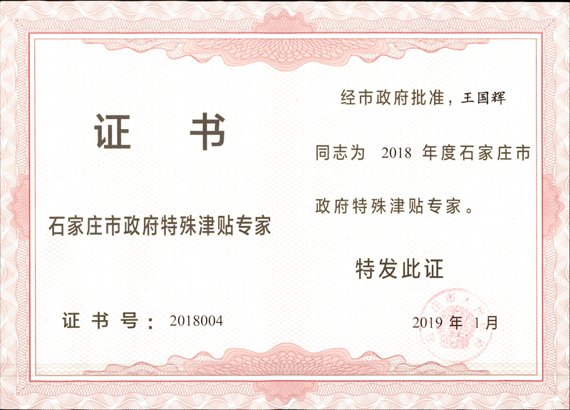 經(jīng)石家莊市人力資源和社會保障局評審,石家莊市人民政府同意,我公司王國輝同志榮獲石家莊市政府特殊津貼專家稱號。