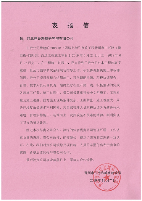 我公司承建的2019年“四路七街”市政工程晉州市中興路(魏征街-向陽街)改造工程,在施工過程中,項目部精心組織策劃,科學(xué)調(diào)配資源,主動認(rèn)真負(fù)責(zé),始終堅守在生產(chǎn)第一線,確保了工期、質(zhì)量、安全,順利實(shí)現(xiàn)了業(yè)主的節(jié)點(diǎn)計劃,得到了業(yè)主和監(jiān)理的一致認(rèn)可,為晉州的后續(xù)市場開拓出了新局面。
