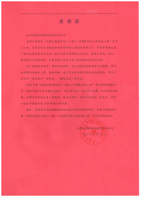 近日,由我公司承建的內(nèi)蒙古酸刺溝二期2×660WM機(jī)組工程樁基工程收到甲方內(nèi)蒙古京泰發(fā)電有限公司的表?yè)P(yáng)信,對(duì)項(xiàng)目部全體員工的辛勤付出,給予了高度認(rèn)可和評(píng)價(jià),并為后續(xù)雙方的合作奠定了良好基礎(chǔ)。這充分彰顯了河北建勘人“雷厲風(fēng)行”的作風(fēng),“顧客至上”的宗旨。我們將繼續(xù)保持我們的施工風(fēng)范和服務(wù)理念,再接再厲,圓滿完成后續(xù)施工任務(wù)!