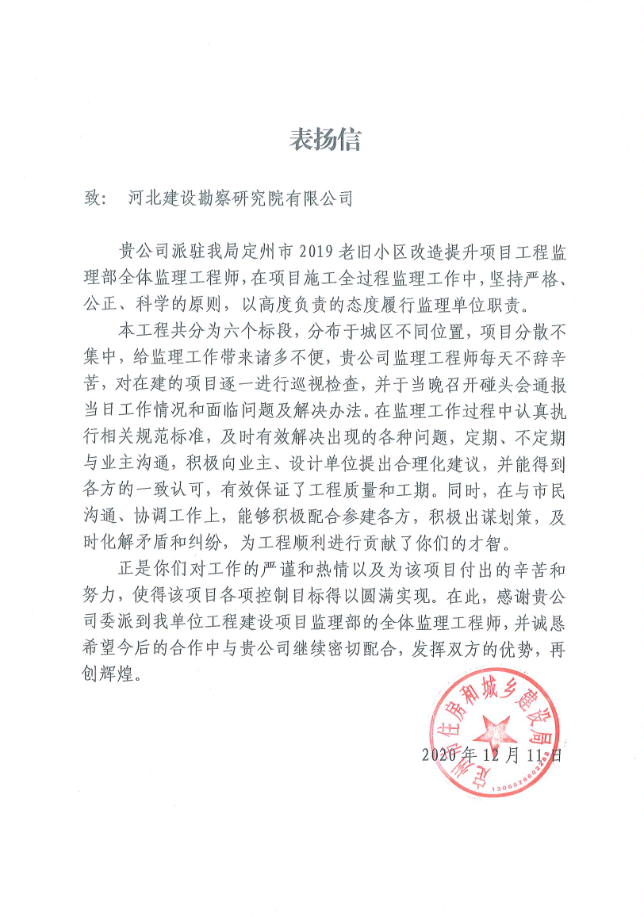 2020年12月我公司收到來(lái)自定州市住房和城鄉(xiāng)建設(shè)局關(guān)于定州市2019老舊小區(qū)改造提升項(xiàng)目監(jiān)理工程的表?yè)P(yáng)信,目前該項(xiàng)目已順利竣工驗(yàn)收。雖然該項(xiàng)目要求時(shí)間緊、任務(wù)重,但在監(jiān)理過(guò)程中我們公司嚴(yán)格按照相關(guān)規(guī)范、標(biāo)準(zhǔn),科學(xué)管理,嚴(yán)謹(jǐn)認(rèn)真負(fù)責(zé)的工作作風(fēng),保證了該項(xiàng)目按期完工,給各方留下了深刻的印象,不僅得到了定州市住房和城鄉(xiāng)建設(shè)局的高度認(rèn)可和贊譽(yù),還贏得了周邊市民的一致好評(píng),樹(shù)立了良好的口碑和信譽(yù),為躋身定州建筑市場(chǎng)更好擴(kuò)展業(yè)務(wù)奠定了基礎(chǔ)。
