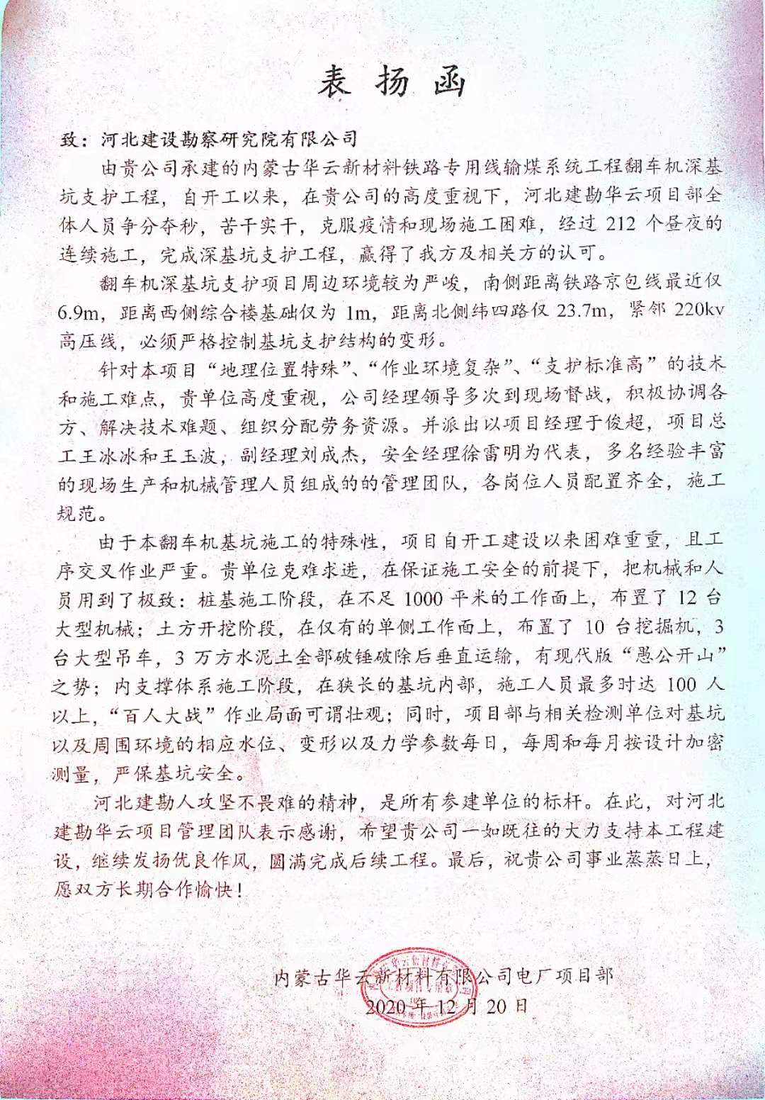 在表揚信中,對于我們河北建勘人攻堅不畏難的精神予以了充分肯定和高度評價,被認為是所有參建單位的標桿,并希望我公司繼續(xù)發(fā)揚優(yōu)良作風,圓滿完成后續(xù)工程,愿雙方長期合作。
