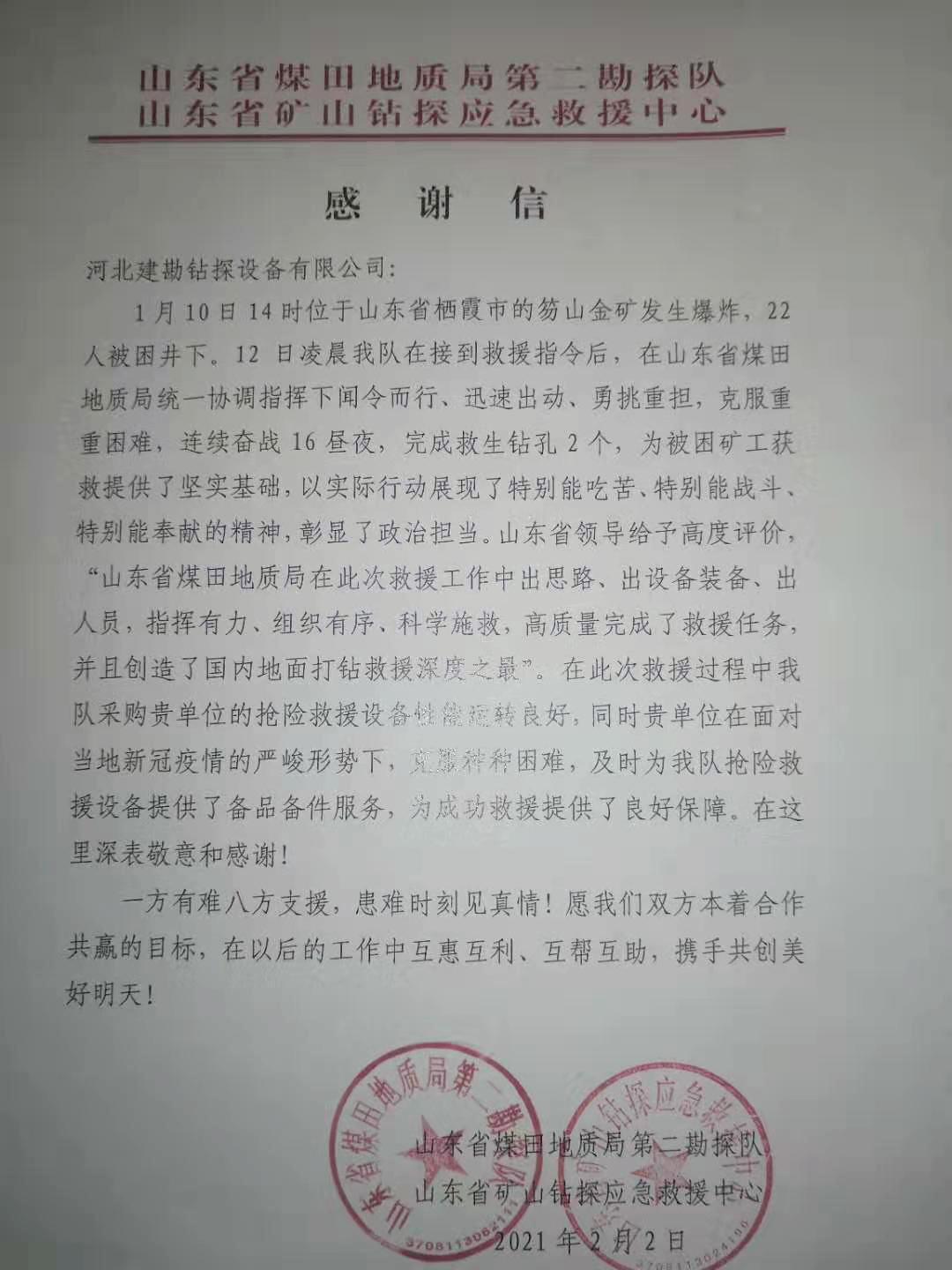 1月10日14時,位于山東省棲霞市的笏山金礦發(fā)生爆炸,22人被困井下。山東省煤田地質(zhì)局第二勘探隊、山東省礦山鉆探應(yīng)急救援中心連續(xù)奮戰(zhàn)16晝夜,完成救生鉆孔2個,為被困礦工獲救提供了堅實基礎(chǔ),高質(zhì)量完成了救援任務(wù),并且創(chuàng)造了國內(nèi)地面打鉆救援深度之最。在此次救援過程中,河北建勘鉆探設(shè)備公司提供的搶險救援設(shè)備性能運轉(zhuǎn)良好,并且在面對當?shù)匦鹿谝咔榈膰谰蝿菹?,克服種種困難,及時為救援隊搶險救援設(shè)備提供了備品備件服務(wù),為成功救援提供了良好保障。為此,山東省煤田地質(zhì)局第二勘探隊和山東省礦山鉆探應(yīng)急救援中心在感謝信中深表敬意和感謝,并希望雙方本著合作共贏的目標,在以后的工作中互惠互利、互幫互助,攜手共創(chuàng)美好明天。