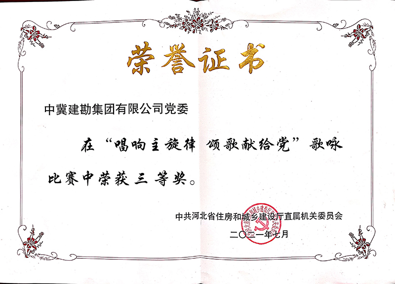 為慶祝中國共產(chǎn)黨建黨100周年,謳歌建黨百年的光輝歷程和豐功偉績,今年以來,公司開展了建黨百年系列慶?;顒?,并積極響應(yīng)上級黨組織工作安排,先后參加了由省直工會組織開展的“永遠(yuǎn)跟黨走•唱支山歌給黨聽”網(wǎng)絡(luò)歌詠活動和省住房和城鄉(xiāng)建設(shè)廳舉辦的“唱響主旋律 頌歌獻(xiàn)給黨”歌詠比賽,用嘹亮的歌聲和飽含深情的演唱充分展示了中冀建勘人積極向上的精神風(fēng)貌,并在比賽中取得優(yōu)秀的成績。