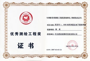 由工程測量公司完成的《武安市1:1000地形測量及地下管線測量》工程獲中國測繪學(xué)會"優(yōu)秀測繪工程"銅獎。