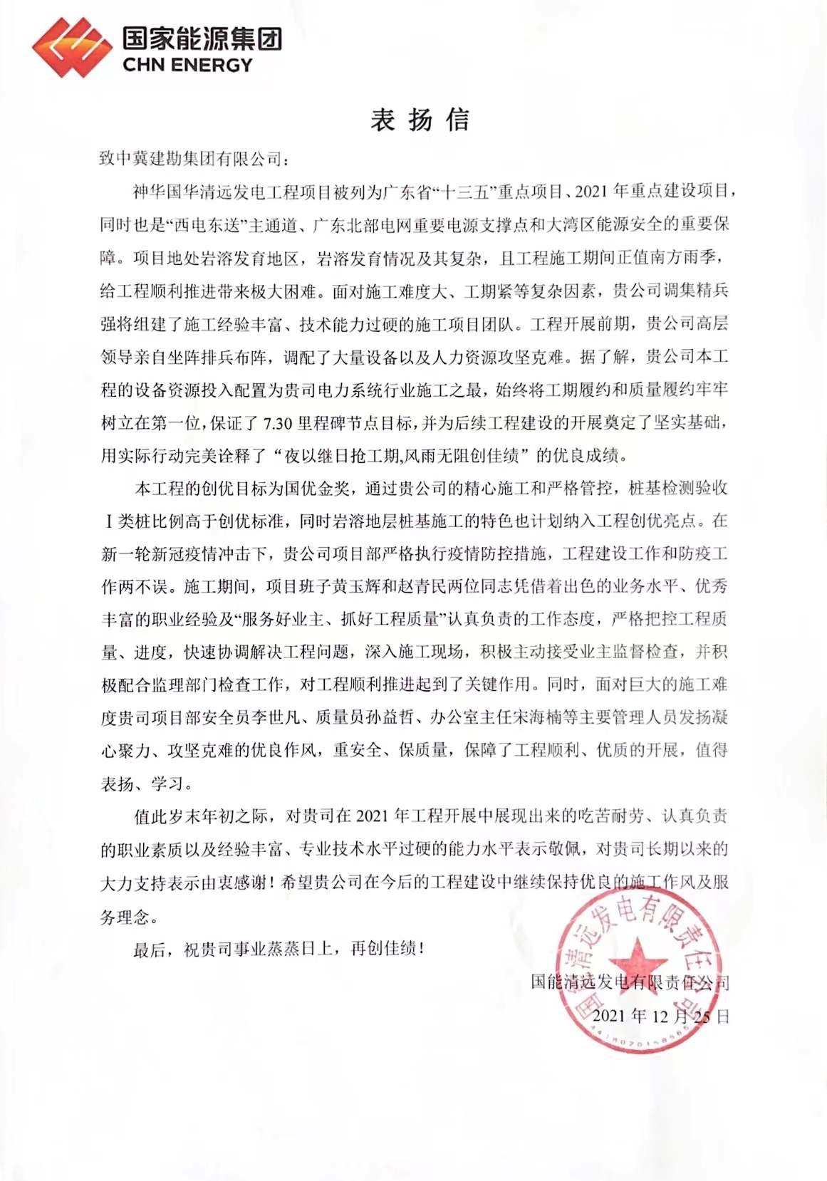 神華國華清遠(yuǎn)發(fā)電工程項(xiàng)目被列為廣東省“十三五”重點(diǎn)項(xiàng)目、2021年重點(diǎn)建設(shè)項(xiàng)目,同時(shí)也是“西電東送”主通道、廣東北部電網(wǎng)重要電源支撐點(diǎn)和大灣區(qū)能源安全的重要保障。我項(xiàng)目在建設(shè)過程中 “夜以繼日搶工期,風(fēng)雨無阻創(chuàng)佳績(jī)”的工作效率得到了高度贊揚(yáng)。