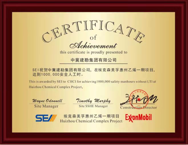 廣東惠州??松梨诨葜菀蚁┮黄陧?xiàng)目樁基工程,榮獲埃克森美孚(惠州)化工有限公司及中國石化工程建設(shè)有限公司惠州項(xiàng)目部“達(dá)到1000000安全人工時(shí)”優(yōu)秀團(tuán)隊(duì)獎(jiǎng),耿蕩榮獲“安全先進(jìn)個(gè)人獎(jiǎng)”。