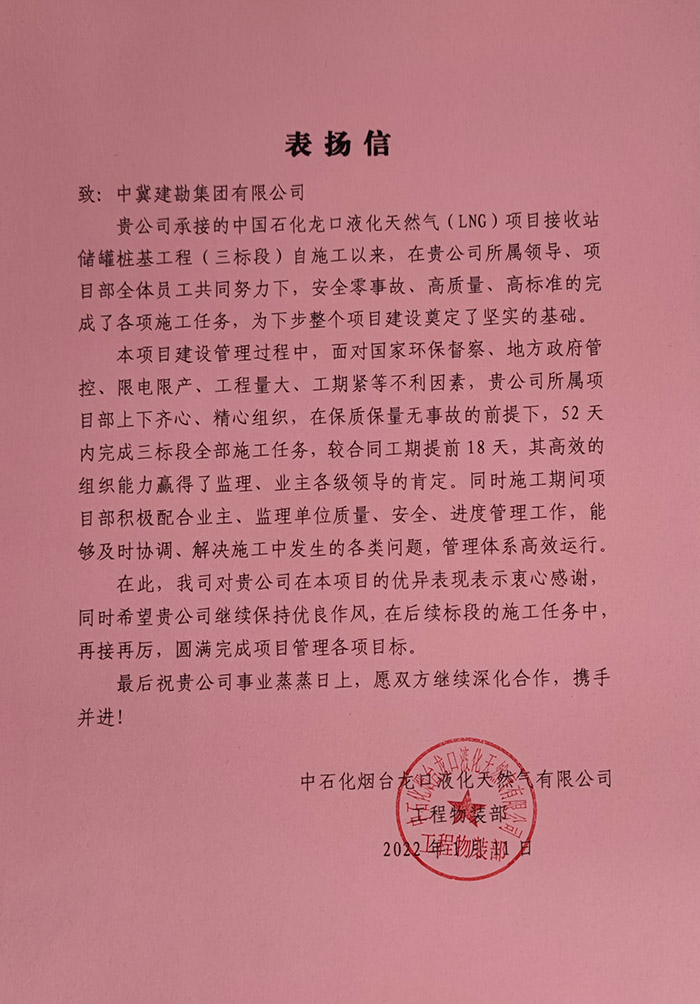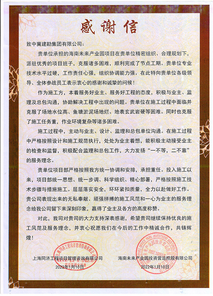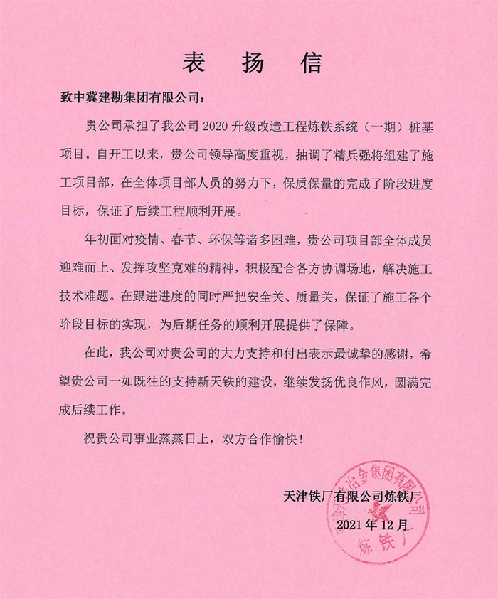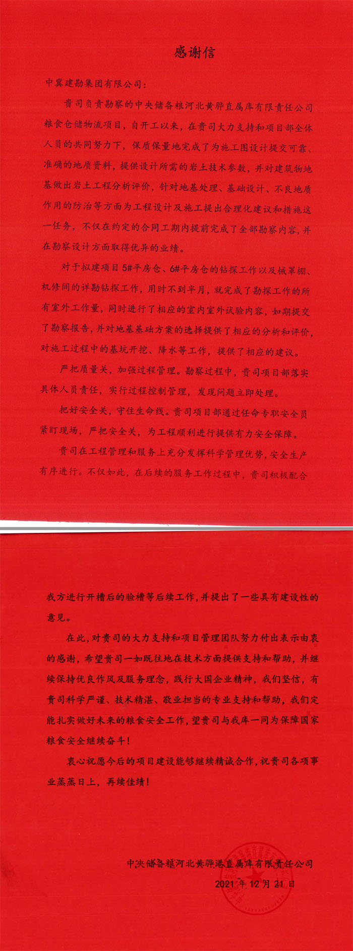 天津鐵廠有限公司煉鐵廠對我公司在疫情期間為確保項(xiàng)目目標(biāo)迎難而上、攻堅(jiān)克難的精神表示贊賞,對我公司一如既往的支持和客戶至上的理念表示感謝。中儲(chǔ)糧河北黃驊直屬庫有限公司對我公司的勘察報(bào)告、后續(xù)驗(yàn)收服務(wù)表示贊許,對公司提供的科學(xué)嚴(yán)謹(jǐn)、技術(shù)精湛、敬業(yè)擔(dān)當(dāng)?shù)膶I(yè)支持和幫助表示感謝。