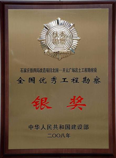 根據(jù)中華人民共和國建設(shè)部第807號文件,關(guān)于公布2006年度全國優(yōu)秀工程勘察設(shè)計獎的公告,我單位石家莊鐵四局改造項目北國—開元廣場巖土工程勘察獲銀質(zhì)獎。