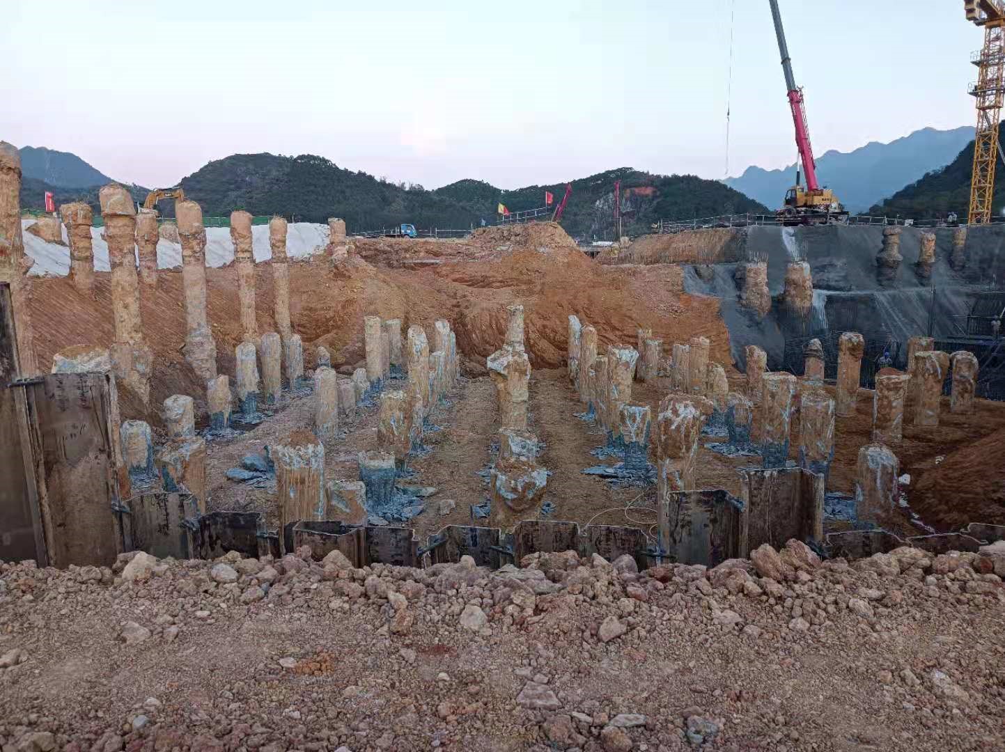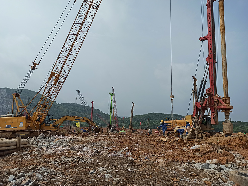 本工程于2021年04月10日開(kāi)工,2022年01月27日現(xiàn)場(chǎng)樁基施工完工,工程施工期間累計(jì)投入施工人員200余人和大功率旋挖鉆機(jī)10臺(tái)以及相關(guān)匹配的機(jī)械設(shè)備??朔擞昙?、高溫和地質(zhì)條件復(fù)雜等諸多不利因素,累計(jì)完成鉆孔灌注樁1857根,處理溶洞約31000m³(含回填片石、水泥、C20砼及注漿和遇溶洞樁超灌混土量)。