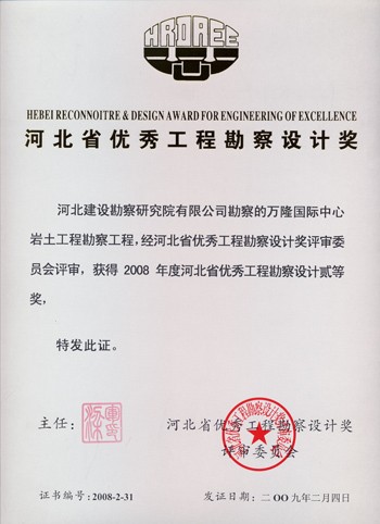 萬(wàn)隆國(guó)際中心巖土工程勘察獲河北省優(yōu)秀工程勘察設(shè)計(jì)二等獎(jiǎng)。