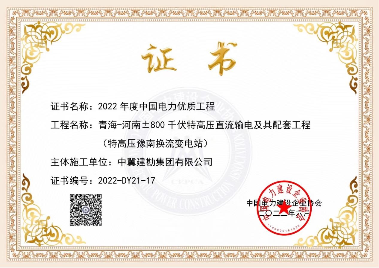 近日,中國電力建設企業(yè)協(xié)會公布了2022年度中國電力優(yōu)質(zhì)工程評審結(jié)果,我公司作為青海-河南±800千伏特高壓直流輸電及配套工程(特高壓豫南換流變電站)樁基施工單位,榮獲2022年度中國電力行業(yè)優(yōu)質(zhì)工程獎。“中國電力優(yōu)質(zhì)工程獎”是我國電力建設行業(yè)工程質(zhì)量的最高榮譽,公司獲此殊榮,充分彰顯了我公司在行業(yè)內(nèi)雄厚的綜合實力,樹立中冀建勘在電力行業(yè)的良好企業(yè)形象。