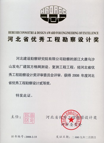 我公司承擔(dān)的浙江大唐烏沙山電廠建筑方格網(wǎng)測(cè)設(shè)、復(fù)測(cè)工程獲河北省優(yōu)秀工程勘察設(shè)計(jì)二等獎(jiǎng)。