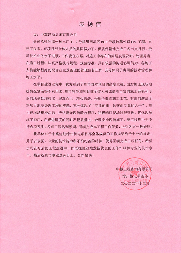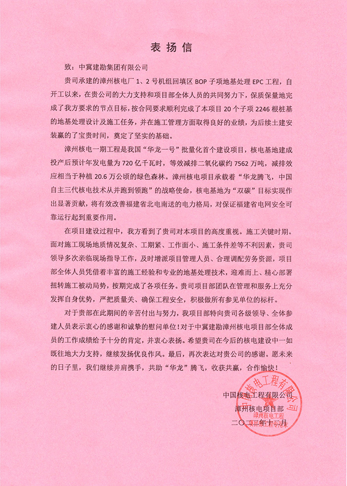 漳州核電一期工程是我國“華龍一號”批量化首個建設(shè)項目,承載著“華龍騰飛,中國自主三代核電技術(shù)從并跑到領(lǐng)跑”的戰(zhàn)略使命,核電基地為“雙碳”目標(biāo)實(shí)現(xiàn)作出顯著貢獻(xiàn),是國家核電建設(shè)的重點(diǎn)項目。在工程建設(shè)過程中面對規(guī)模較大、場地分散、交叉施工等多項不利因素,項目部迎難而上、精心部署、晝夜施工,確保安全、質(zhì)量的情況下按期完成了各項任務(wù)。項目部在谷習(xí)光同志的帶領(lǐng)下,在管理和服務(wù)上充分發(fā)揮自身優(yōu)勢,積極爭當(dāng)所有參見單位的標(biāo)桿,得到了甲方和監(jiān)理的高度贊揚(yáng),為以后更多的合作奠定了堅實(shí)基礎(chǔ)。