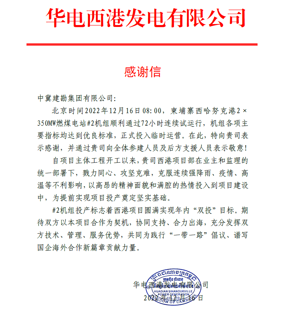 柬埔寨西哈努克港2×350MW燃煤電站#1機(jī)組順利通過柬埔寨國家電力公司要求的滿負(fù)荷性能試驗,標(biāo)志著中國華電在柬投資興建的最大火電項目首臺機(jī)組正式投產(chǎn)發(fā)電。自該項目主體工程開工以來,西港項目部全體人員在業(yè)主和監(jiān)理的統(tǒng)一部署下,勠力同心、攻堅克難,克服連續(xù)降雨、疫情、高溫等不利影響,以高昂的精神面貌和滿腔的熱情投入到項目建設(shè)中,為項目提前實(shí)現(xiàn)#1機(jī)組投產(chǎn)奠定堅實(shí)基礎(chǔ)。