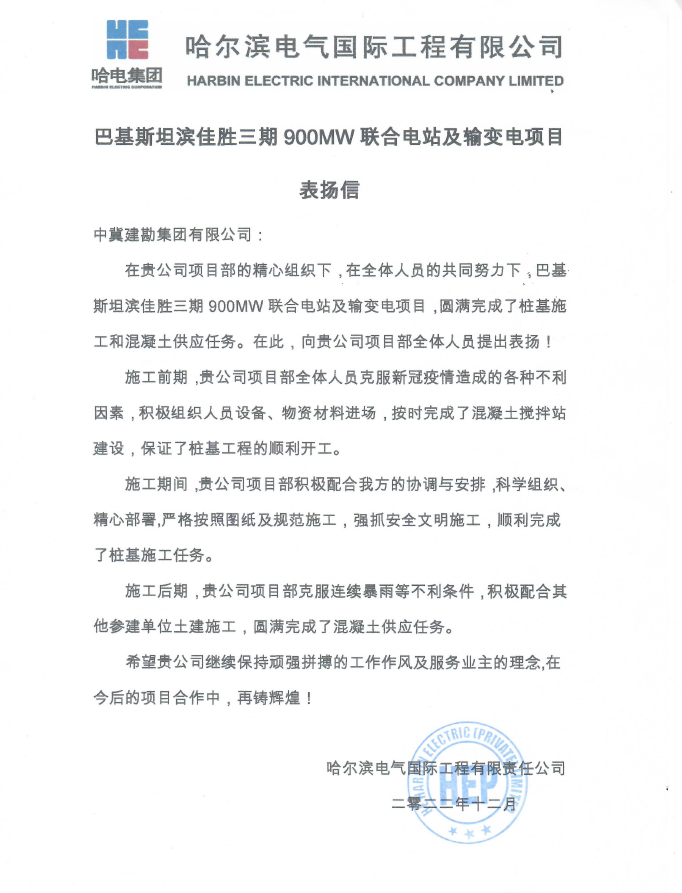 巴基斯坦濱佳勝三期900MW聯(lián)合電站及輸變電項目,圓滿完成了樁基施工和混凝土供應(yīng)任務(wù)。施工期間,項目部員工積極配合業(yè)主的協(xié)調(diào)與安排,科學(xué)組織、精心部署,嚴(yán)格按照圖紙及規(guī)范施工,在克服連續(xù)暴雨等不利條件,搶抓安全文明施工,確保圓滿完成施工任務(wù)。我們頑強(qiáng)拼搏的工作作風(fēng)及服務(wù)業(yè)主的理念得到了業(yè)主的高度認(rèn)可。