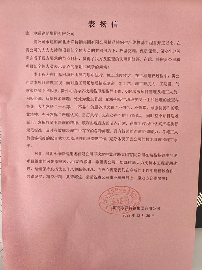 河北永洋特鋼集團(tuán)有限公司精品特鋼生產(chǎn)線樁基工程自開工以來,在項目部全體人員的共同努力下,攻堅克難,保質(zhì)保量保安全地圓滿完成了業(yè)主要求的節(jié)點(diǎn)目標(biāo),大力發(fā)揚(yáng)“一不等、二不靠”的服務(wù)理念和“不怕苦、不怕累、頑強(qiáng)拼搏”的敬業(yè)精神,贏得了業(yè)主及監(jiān)理的認(rèn)可和好評。