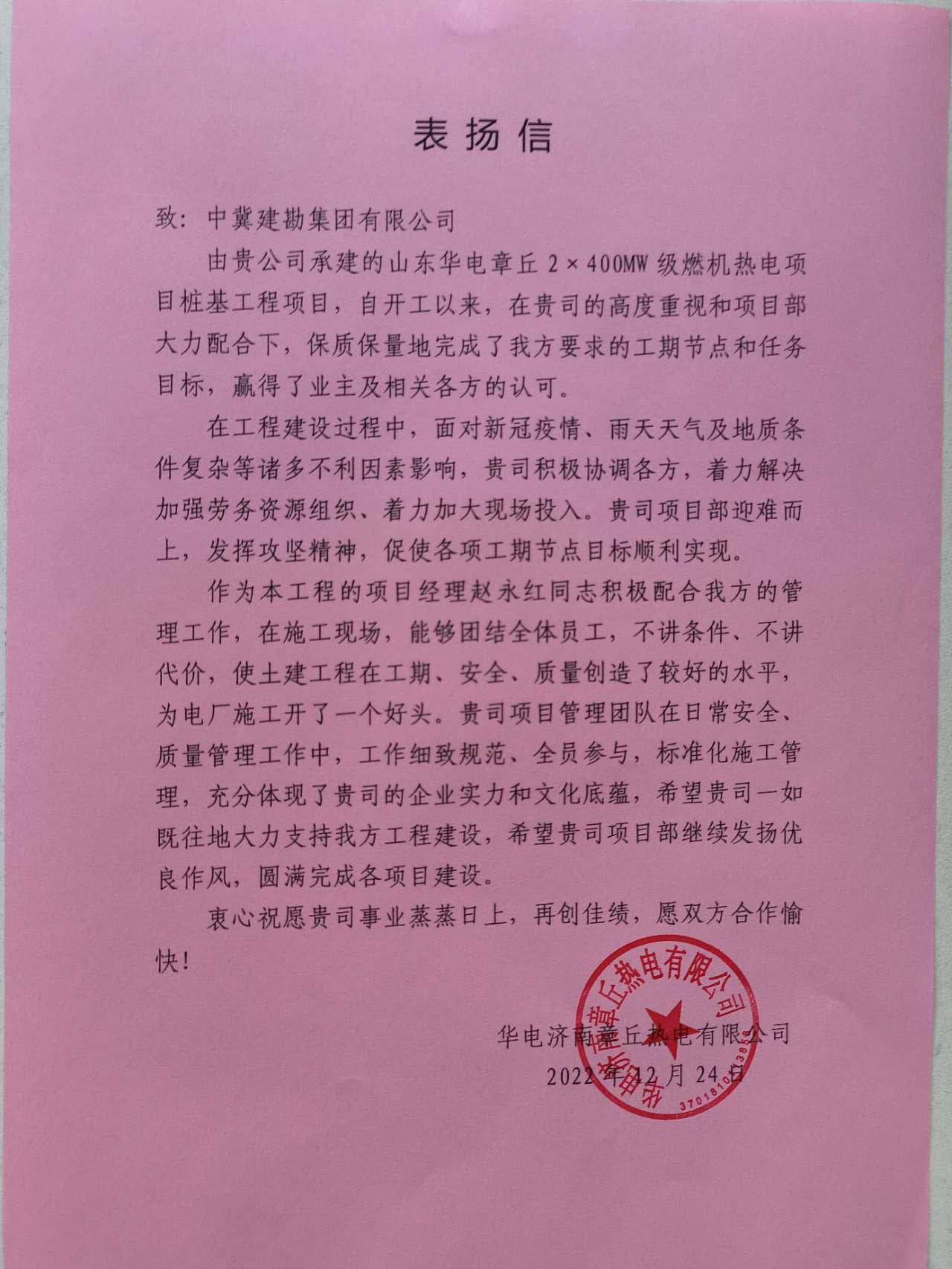 山東華電章丘2×400MW級燃機(jī)熱電項目樁基工程,在工程建設(shè)過程中,面對新冠疫情、雨天天氣及地質(zhì)條件復(fù)雜等諸多不利影響,在項目經(jīng)理趙永紅同志的帶領(lǐng)下,能夠團(tuán)結(jié)一致,不講條件,使土建工程在工期、安全、質(zhì)量創(chuàng)造了較好的水平,為電廠施工開了一個好頭。項目管理團(tuán)隊在日常安全、質(zhì)量管理工作中,工作細(xì)致規(guī)范、標(biāo)準(zhǔn)化施工管理,充分體現(xiàn)了我公司的企業(yè)實(shí)力和文化底蘊(yùn)。