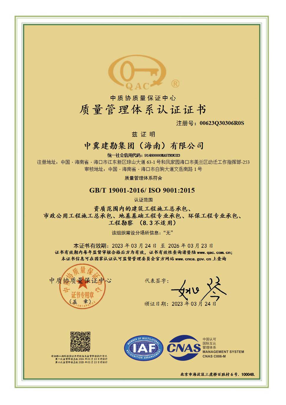 2023年3月13日至18日,經(jīng)認(rèn)證機(jī)構(gòu)現(xiàn)場(chǎng)審核,中冀建勘集團(tuán)(海南)有限公司順利通過(guò)了綜合管理體系的認(rèn)證,并于3月24日取得了中質(zhì)協(xié)質(zhì)量保證中心頒發(fā)的綜合管理體系認(rèn)證證書(shū)。