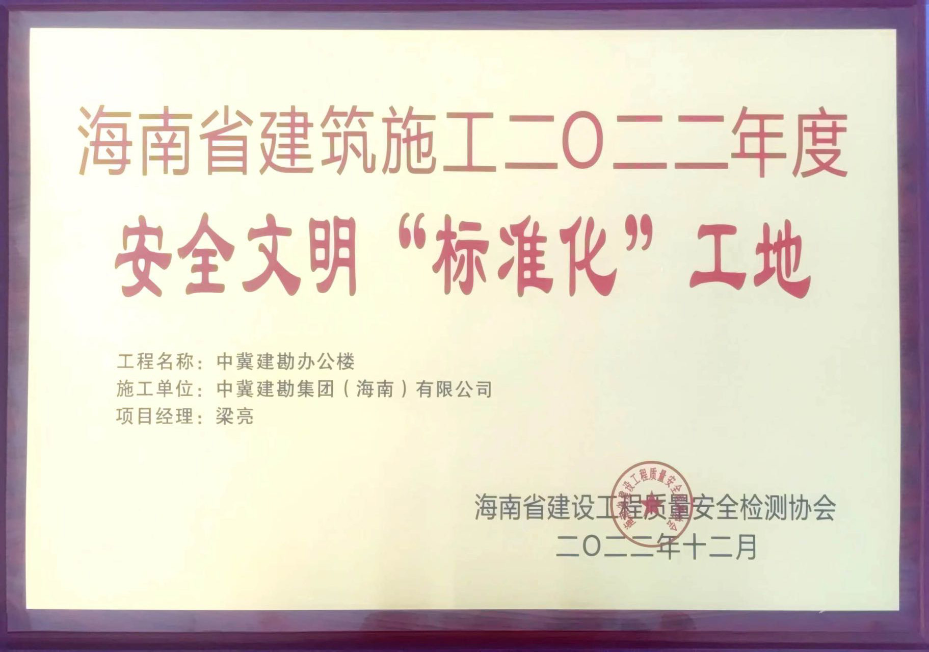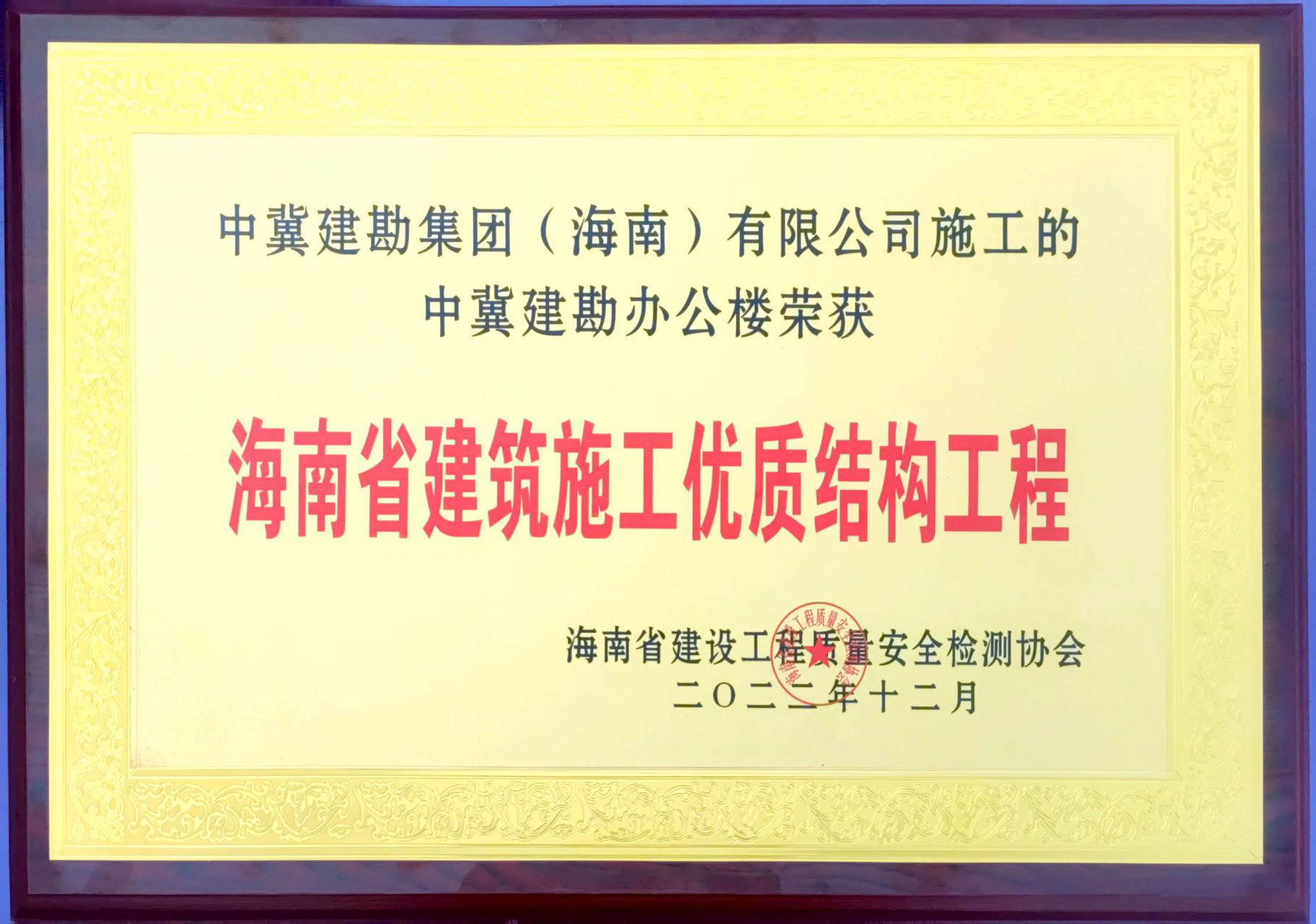 中冀建勘辦公樓榮獲“海南省建筑施工優(yōu)質(zhì)結(jié)構(gòu)工程”及海南省建筑施工二0二二年度安全文明“標(biāo)準(zhǔn)化”工地榮譽(yù)稱(chēng)號(hào)