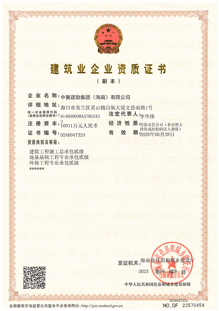 在集團(tuán)公司領(lǐng)導(dǎo)的運籌帷幄下,2023年6月28日海南省住建廳通過了中冀建勘集團(tuán)(海南)有限公司建筑業(yè)企業(yè)資質(zhì)升級申請,順利取得建筑工程施工總承包貳級、地基基礎(chǔ)工程專業(yè)承包貳級和環(huán)保工程專業(yè)承包貳級資質(zhì)。