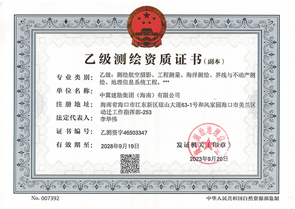 中冀建勘集團(海南)有限公司喜獲測繪乙級資質(zhì)證書