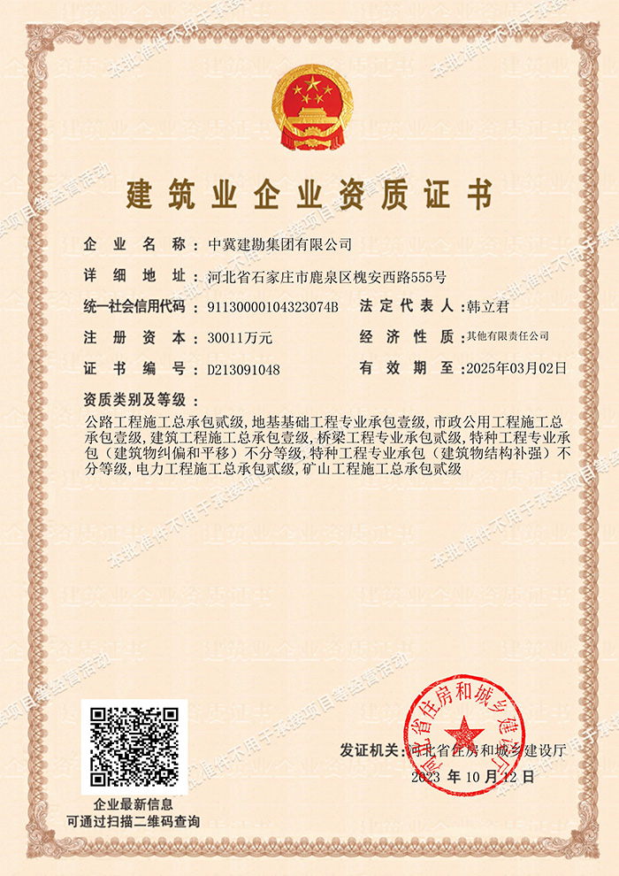 為拓展公司業(yè)務(wù)范圍,在公司領(lǐng)導(dǎo)的精心策劃下,經(jīng)過安全生產(chǎn)部的不懈努力,集團(tuán)公司于2023年10月12日經(jīng)河北省交通廳、河北省住建廳審核批準(zhǔn),成功取得了公路工程施工總承包貳級資質(zhì),該資質(zhì)的取得將為集團(tuán)公司拓展縣、鄉(xiāng)、村公路工程業(yè)務(wù)提供了先決條件,為增強地方市場的開拓能力、提高地方市場競爭力提供有力支撐,將在助力集團(tuán)公司高質(zhì)量發(fā)展、升級轉(zhuǎn)型上貢獻(xiàn)更大力量。