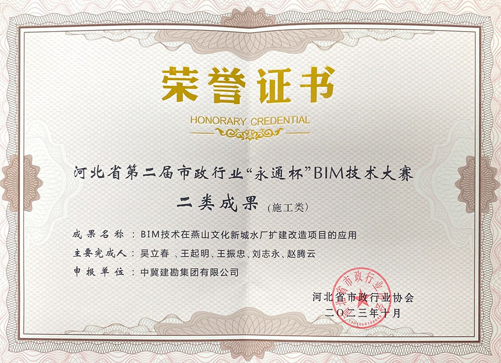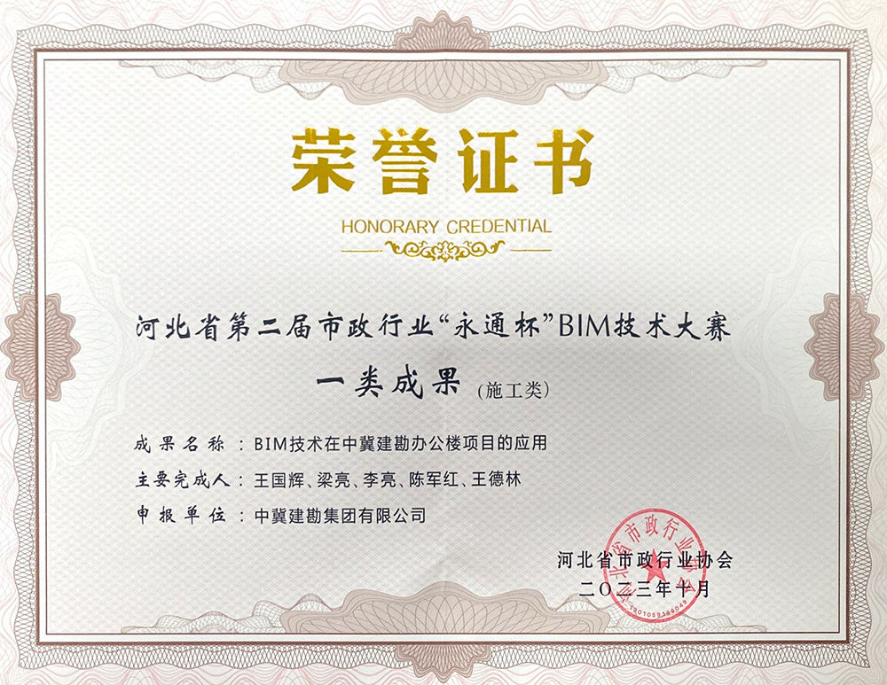 近日,河北省市政行業(yè)協(xié)會(huì)發(fā)文《關(guān)于公布河北省市政行業(yè)第二屆“永通杯”BIM技術(shù)應(yīng)用大賽結(jié)果的通知》(冀市協(xié){2023}37號(hào)),我公司參賽項(xiàng)目“BIM技術(shù)在中冀建勘辦公樓項(xiàng)目的應(yīng)用”項(xiàng)目榮獲一類成果、“BIM技術(shù)在燕山文化新城水廠擴(kuò)建改造項(xiàng)目的應(yīng)用”項(xiàng)目榮獲二類成果。