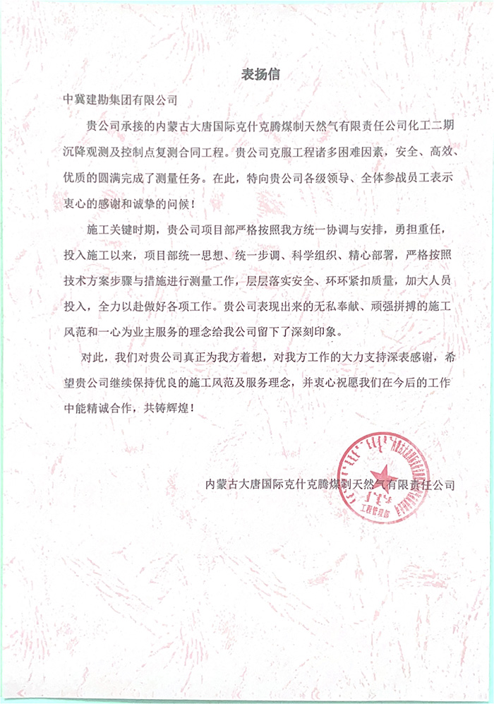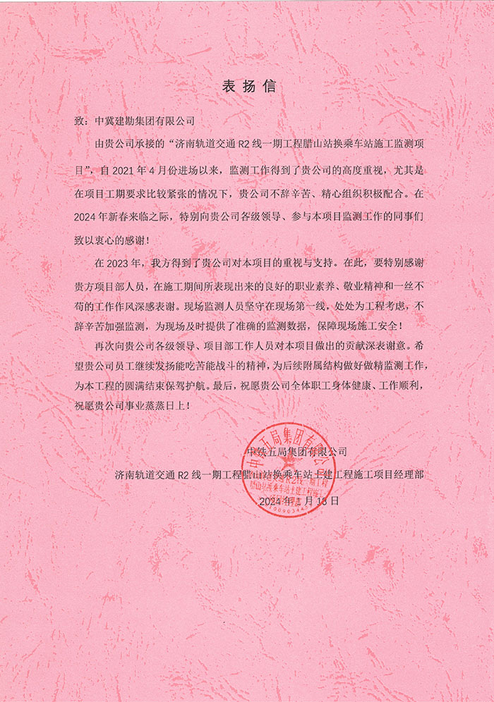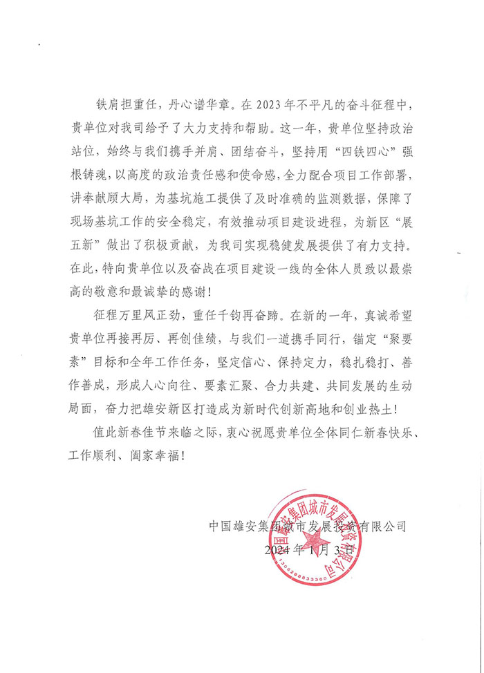 近期,公司陸續(xù)收到中國雄安集團(tuán)城市發(fā)展投資有限公司、河北雄安軌道快線有限責(zé)任公司、中國雄安集團(tuán)生態(tài)建設(shè)投資有限公司、中鐵五局、中鐵十七局、鄭州地鐵集團(tuán)、內(nèi)蒙古大唐國際克什克騰旗煤制天然氣電廠、大唐內(nèi)蒙古多倫電廠等業(yè)主單位發(fā)來的感謝信。我公司認(rèn)真負(fù)責(zé)、敢打能打硬仗的工作態(tài)度、頑強(qiáng)拼搏的施工風(fēng)范和一心為業(yè)主服務(wù)的理念,贏得了業(yè)主的高度認(rèn)可和贊揚(yáng),特發(fā)來感謝信深表感謝!