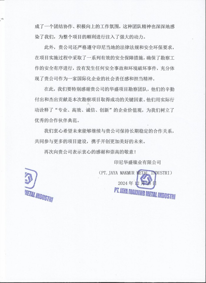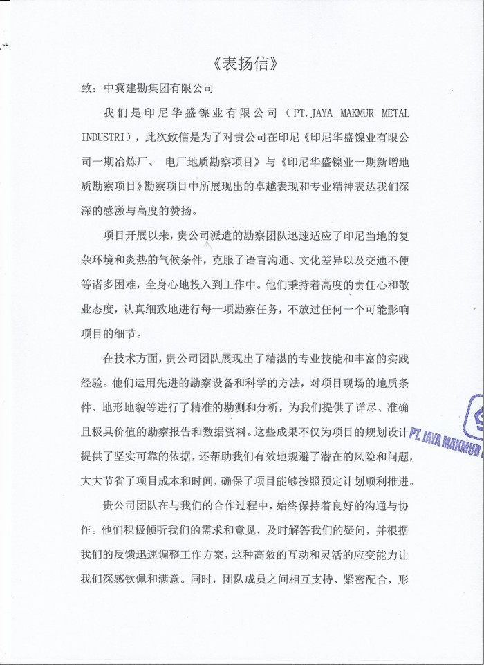 印尼華盛鎳業(yè)有限公司發(fā)來了表揚信。在印尼華盛鎳業(yè)有限公司一期冶煉廠、電廠地質(zhì)勘察項目及印尼華盛-年產(chǎn)200萬噸綜合鋼鐵項目的勘察任務中,印尼華盛勘察項目部全體職工迅速適應印尼當?shù)氐膹碗s環(huán)境和炎熱的氣候條件,克服了語言溝通、文化差異以及交通不便等諸多困難,全身心地投入到工作中。在項目實施過程中,嚴格遵守印尼當?shù)氐姆煞ㄒ?guī)和安全環(huán)保要求,采取了一系列有效的安全保障措施,確保了勘察工作的安全有序進行。這種高度的專業(yè)素養(yǎng)和社會責任感,贏得了業(yè)主方的高度贊揚和深深感激。