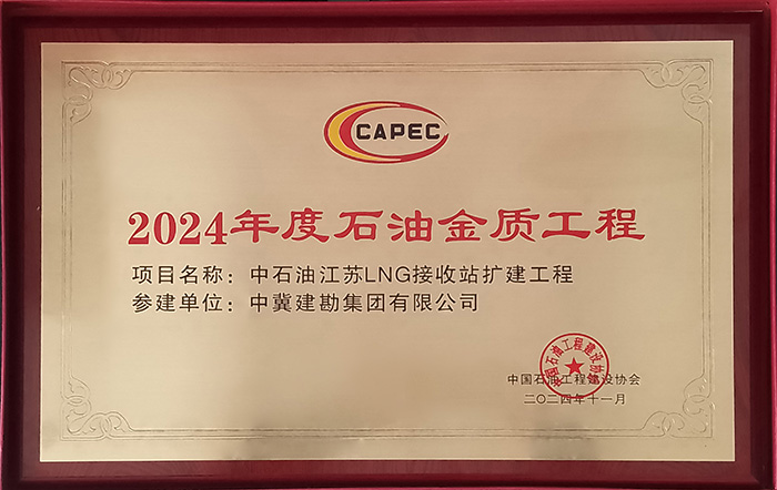 近日,集團公司收到中國石油工程建設(shè)協(xié)會頒發(fā)的獎牌,由二公司參建的中石油江蘇LNG接收站擴建工程項目喜獲“2024年度石油金質(zhì)工程”。