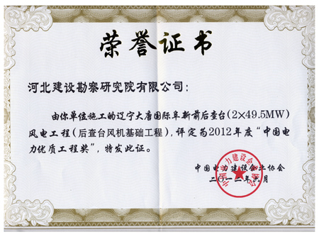 近日,由我公司參與施工的遼寧大唐國際阜新前后查臺2×49.5MW風(fēng)電工程(后查臺風(fēng)機(jī)基礎(chǔ)工程)被中國電力建設(shè)企業(yè)協(xié)會評定為2012年度“中國電力優(yōu)質(zhì)工程獎”。