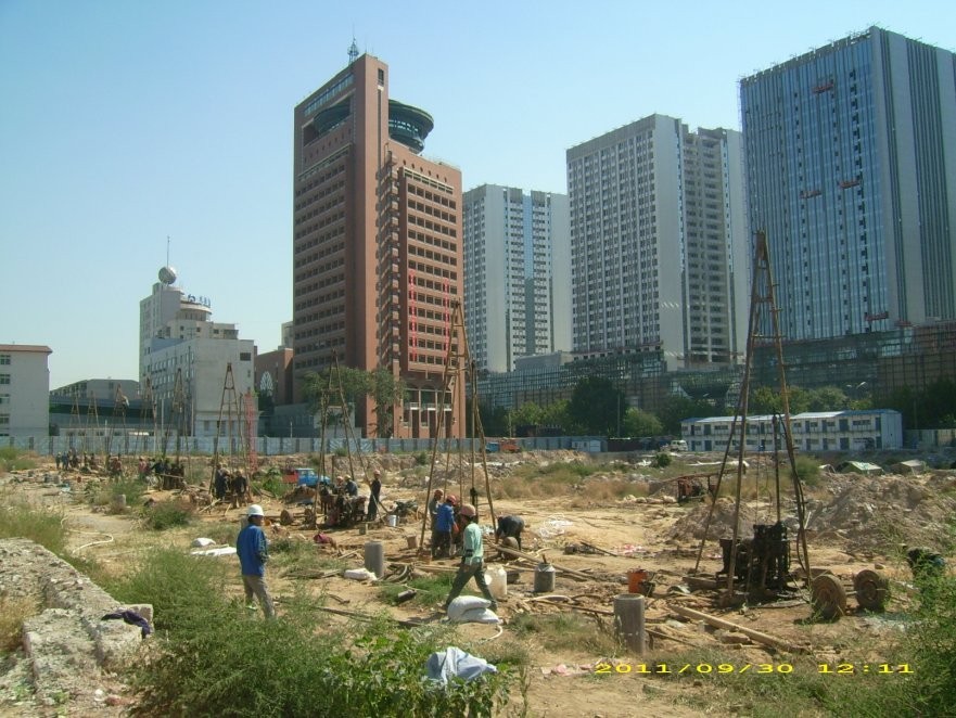 擬建場地基巖面起伏較大,巖溶地質(zhì)條件復雜,基巖內(nèi)溶洞、裂隙發(fā)育。溶洞最大高度為9.7m,對勘察揭露的空洞、半充填溶洞及破碎帶采用先充填粗骨料后注漿治理方法;對嵌巖樁采用“一樁一探、探治結(jié)合”;根據(jù)巖溶治理方案專家論證評審意見,對對原古采煤巷道采用鉆探與物探相結(jié)合的方法。利用鉆探孔直接在巷道平面位置及周邊進行巷道探查,利用井下電視、井間CT、淺層地震和瞬變電磁物探手段進行驗證,同時對遠年采空區(qū)進行了探查驗證并進行了治理。2012年4月22日,專家評審驗收意見為:提供的巖溶地基治理竣工資料齊全、內(nèi)容較全面,滿足巖溶地基治理工程竣工驗收評審要求;檢測單位采用了鉆探及面波等檢測方法可靠;巖溶地基治理效果達到了設(shè)計要求,同意通過竣工驗收評審。