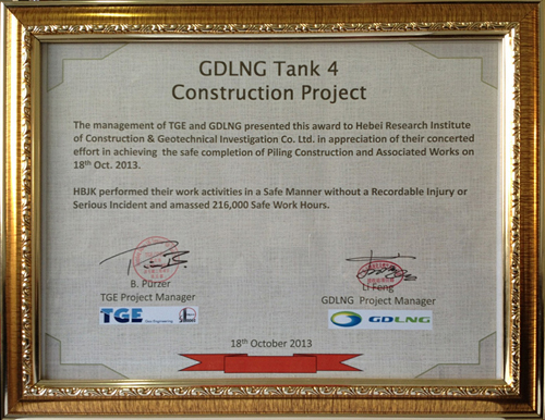 廣東大鵬LNG工程自2013年4月18日開工,至2013年9月4日完成樁基施工,10月份完成包括鑿樁頭在內(nèi)的所有現(xiàn)場施工任務。在此期間,項目部全體成員一直堅持安全第一的理念,嚴格按照總包、業(yè)主的安全文明施工要求穩(wěn)步推進工作,得到了總包、監(jiān)理、業(yè)主的一致好評,工程結束后總包TGE為我公司頒發(fā)了安全文明施工獎狀。