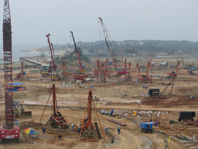 粵東液化天然氣項目由中海油投資建設(shè),CB&I歐洲工程公司承攬三個儲罐的設(shè)計、施工、采購工作,受美國CB&I歐洲工程公司委托,我公司承接了三個罐區(qū)回填砂工作、樁基工程施工和檢測。自2013年3月7日開始施工,至2013年11月7日竣工,總計完成回填砂工作量約為7.2萬m3,混凝土灌注樁1074根。
