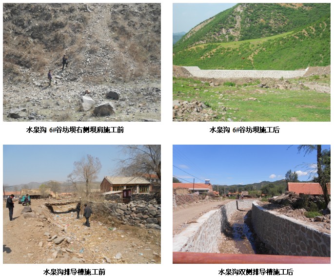 本治理工程施工時間為2013年5月8日-2013年9月10日,包括水泉村范圍內(nèi)水泉溝、王小溝兩條溝谷,主要施工項目為谷坊壩、排導槽、擋墻工程,其中水泉溝內(nèi)包括6道谷坊壩,PM2坡面護腳擋墻,水泉溝單側(cè)排導槽(0~249.3m),水泉溝雙側(cè)排導槽(0~708.6m),王小溝內(nèi)包括道谷坊壩7道,王小溝單側(cè)排導槽(0~271.2m),王小溝雙側(cè)排導槽(0~372m)。